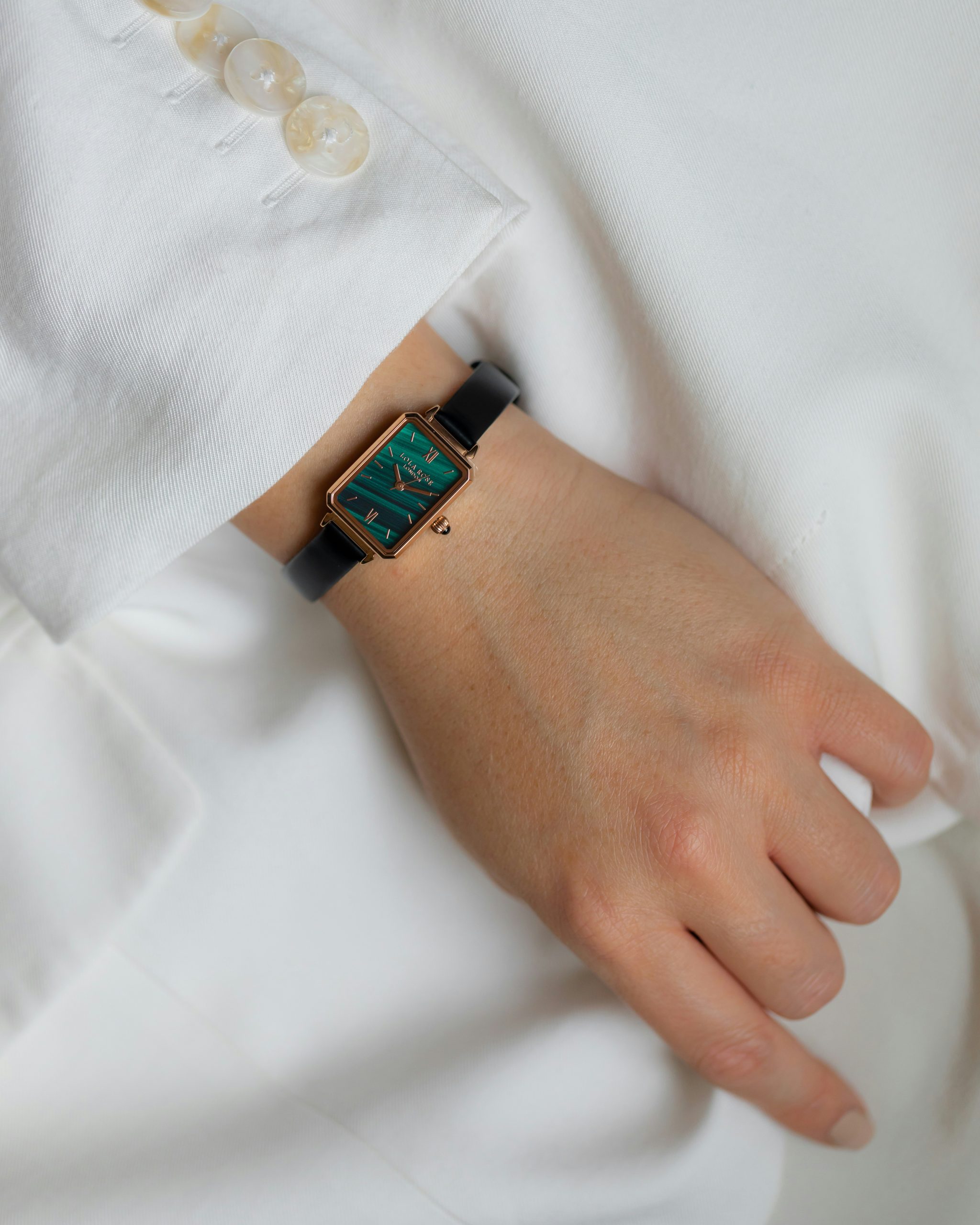 + Free ShippingThe Rectangular Riviera is a petite, elegant watch defined by its sophisticated rose gold-toned case and striking malachite-green dial.
